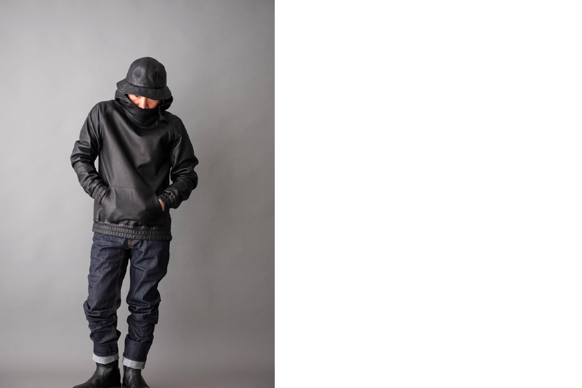 レザーが柔らかく伸縮性があるので普通のパーカーのようにガバッと頭から被る事もできますが、サイドのジップを開けてジャケットのように脱ぎ着する事も出来ます。