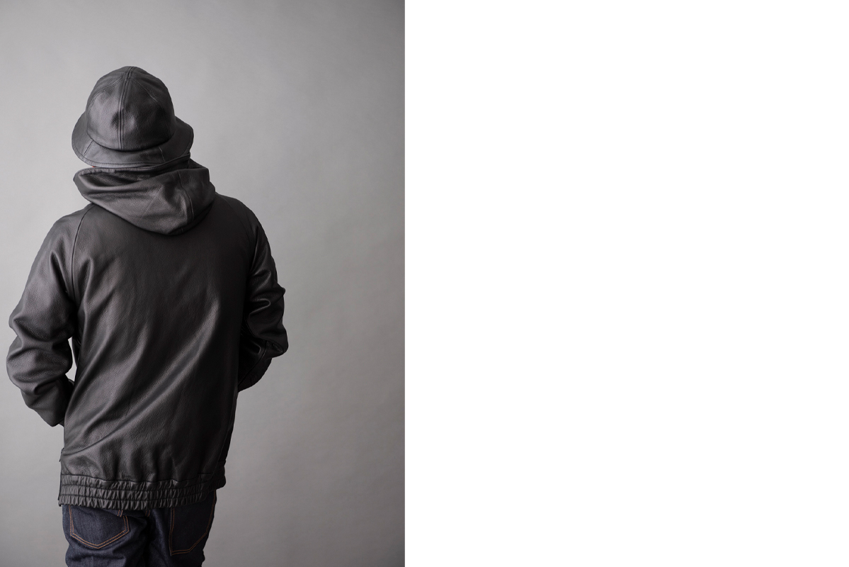 レザーの厚みは1.2oを使用しています。程よく重量感のあるパーカーに仕上げました。この厚みがパーカーととても相性が良いです。