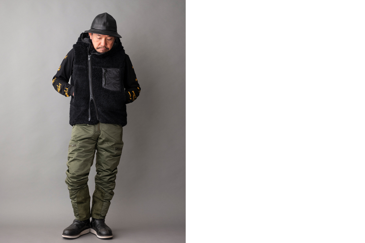 アウターはライダースジャケットやGジャンも良いし、あえてMA-1などミリタリージャケットと合わせるのはいかがでしょう?