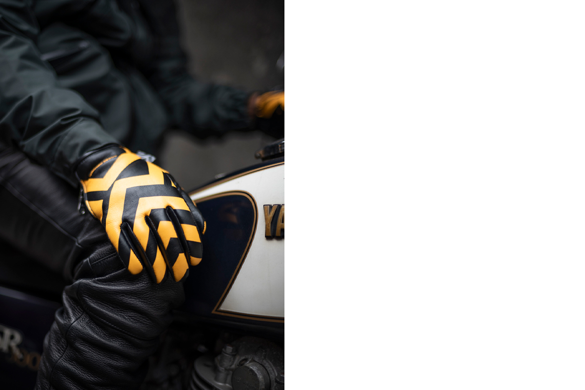 Crafted from 1.2mm thick cowhide leather, the gloves strike a balance between durability and flexibility ― ideal for motorcycle use. The dazzle pattern is applied using a silk screen print on the surface of the leather. Through repeated use and exposure to rain and wear, the print settles naturally into the leather, creating a worn-in, authentic look over time. Tests have shown the pattern remains intact under practical conditions.