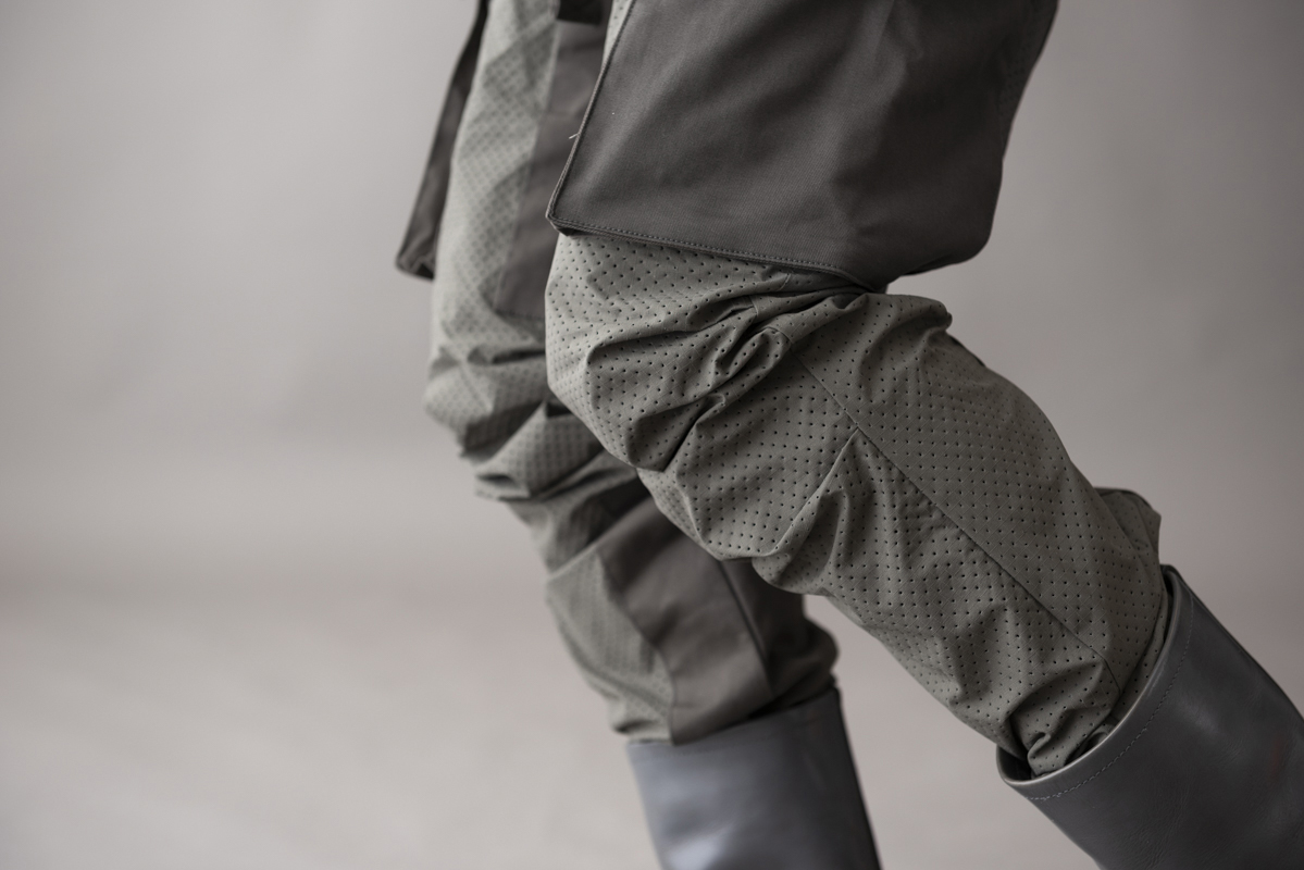 そのリップストップパンチングメッシュの生地でサイドに大きなポケットのカーゴパンツを作りました。