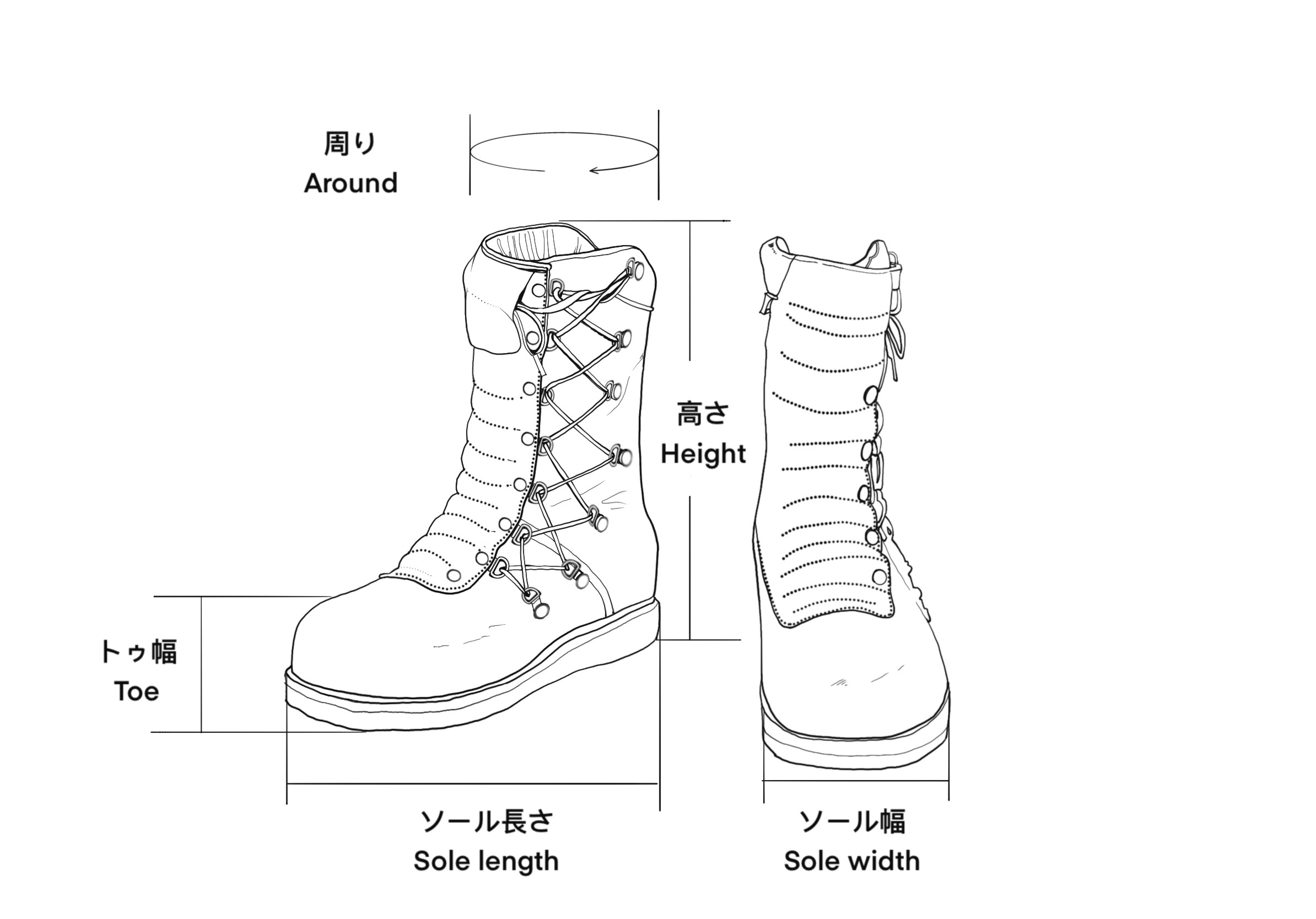 | 高さ / Height | シャフト幅 / width | トゥ幅 / toe | ソール長さ / Sole length | ソール幅 / Sole width | |