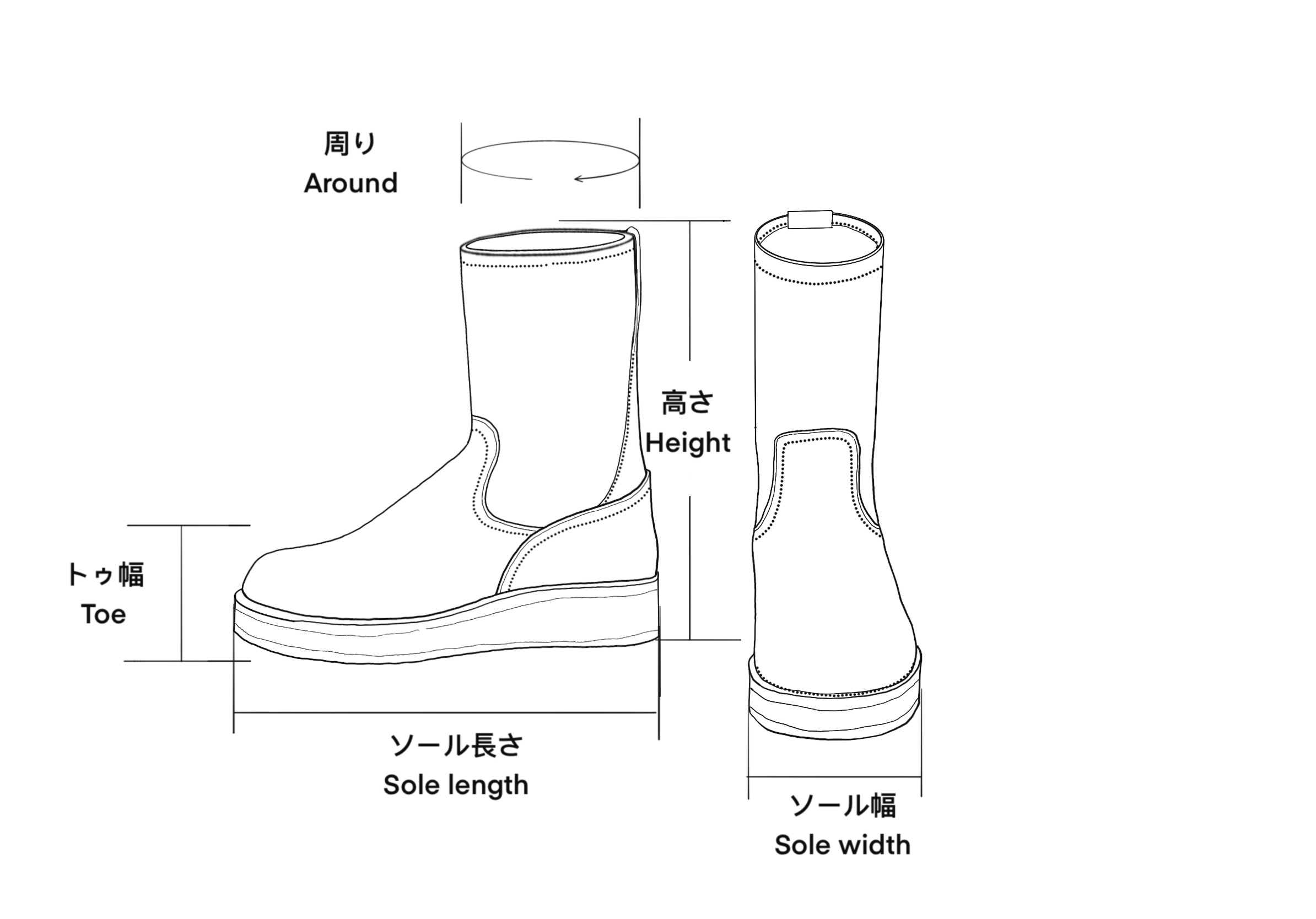 | 高さ / Height | シャフト周り / Around | トゥ幅 / toe | ソール長さ / Sole length | ソール幅 / Sole width | |